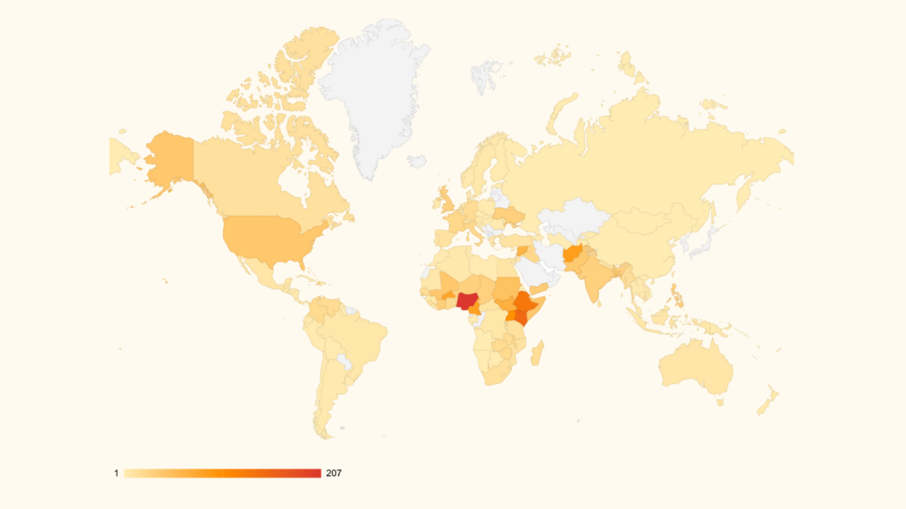 Humanitarians working in local organisations demonstrated high levels of interest and experimentation with AI, with the highest number of survey respondents from countries experiencing protracted crises including Nigeria, DRC, Ethiopia, South Sudan, Sudan, Afghanistan, Syria, and Burkina Faso.